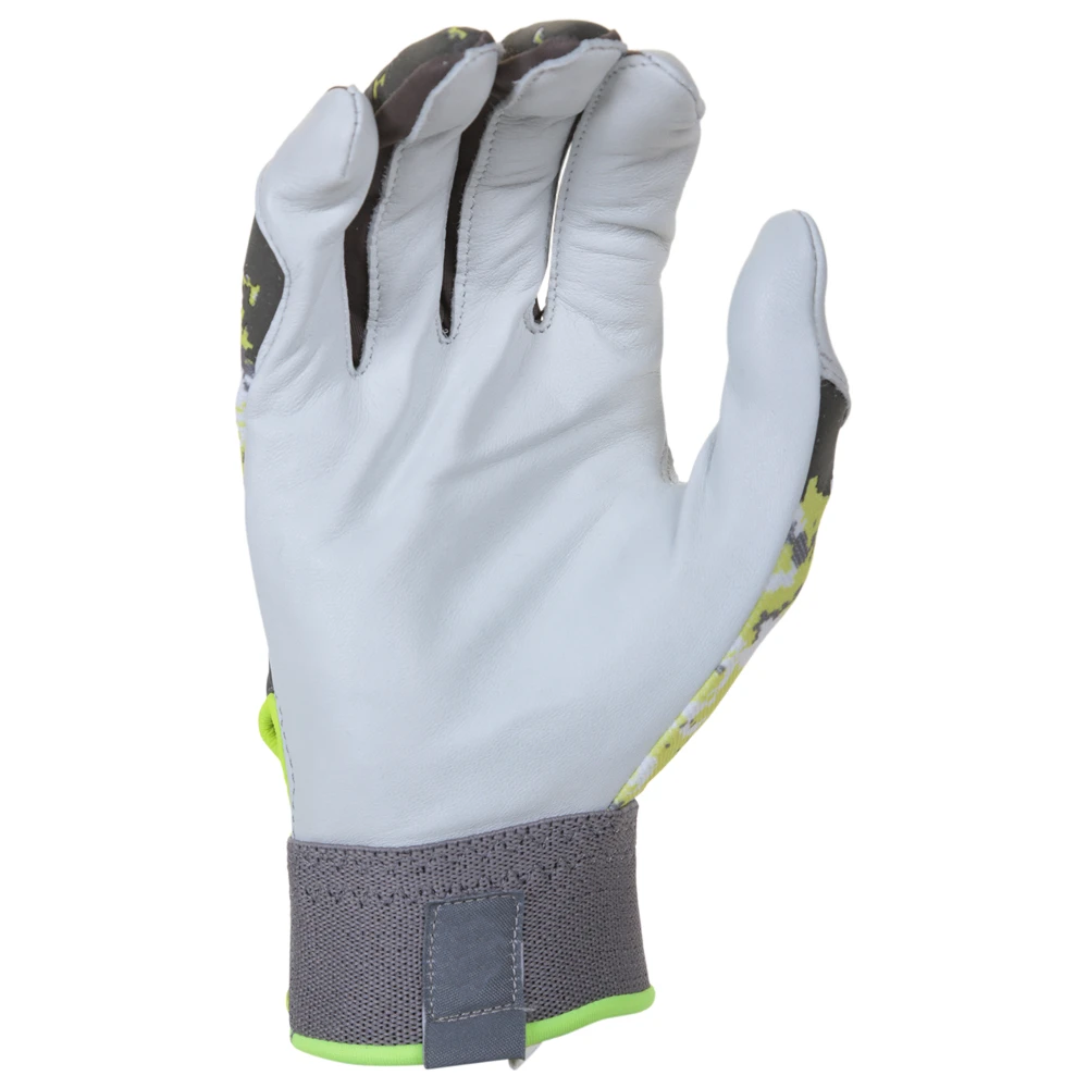 These batting gloves feature an updated pro fit with a smooth sheepskin leather palm, a spandex backhand and silicon overlays for added structure .