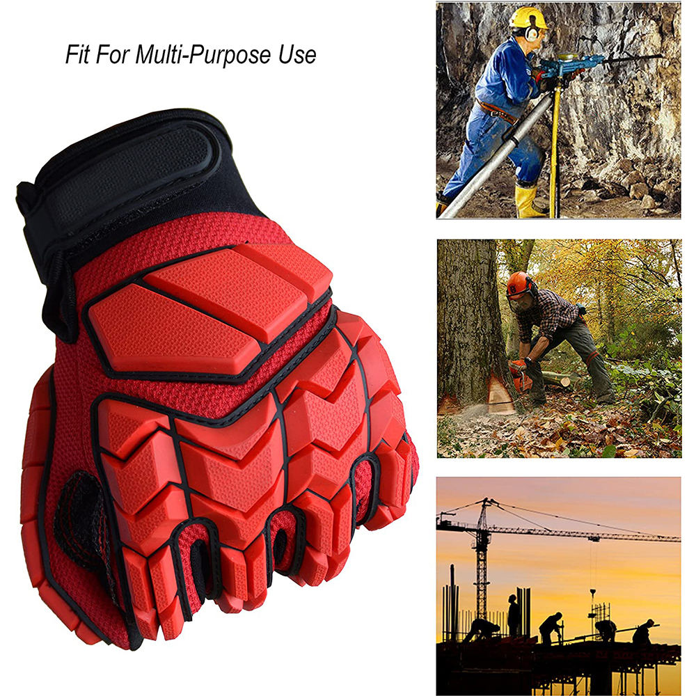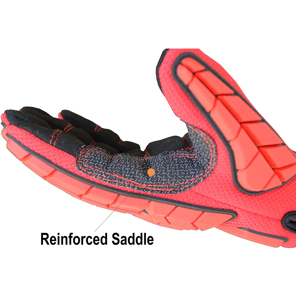 Safety work gloves include reinforced stitching on palm and thumb for extended wear and durability