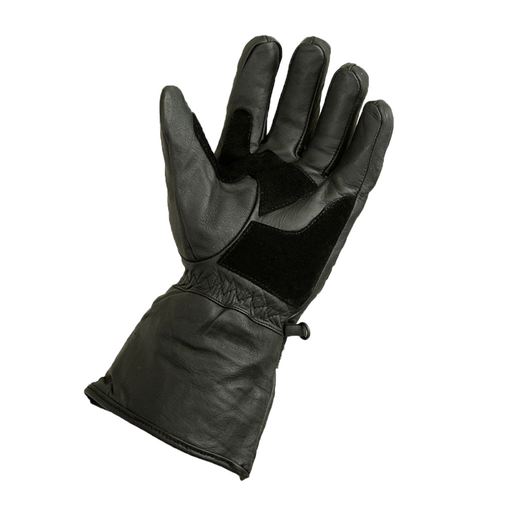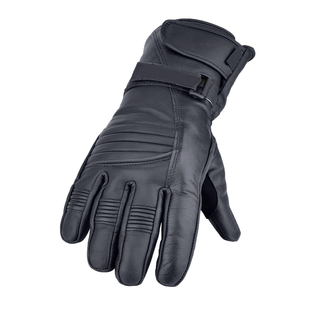 Motorcycling gloves are typically gloves made of leather. They may have gauntlets to protect the rider's wrists